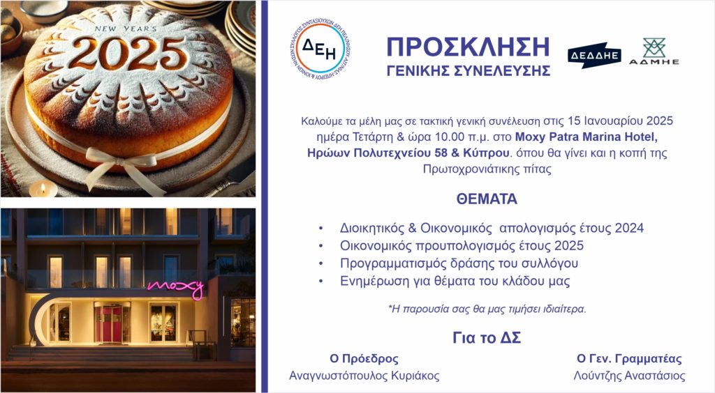 ΓΕΝΙΚΗ ΣΥΝΕΛΕΥΣΗ Post author:admin Post published:13 Ιανουαρίου, 2025 Post category:Ανακοινώσεις Post comments:0 Comments FacebookTweetPin FacebookTweetPin You Might Also Like Το πρόγραμμα πληρωμής των κύριων και επικουρικών συντάξεων του Ιουνίου 9 Μαΐου, 2023 ΓΕΝΟΠ – ΔΕΗ. Απεργία την Τρίτη 19 Οκτωβρίου 2021 30 Σεπτεμβρίου, 2021 72 χρόνια μετά (Δ)ΕΗ… 8 Αυγούστου, 2022 Αφήστε μια απάντηση Ακύρωση απάντησηςCommentEnter your name or username to comment Enter your email address to comment Enter your website URL (optional) Αποθήκευσε το όνομά μου, email, και τον ιστότοπο μου σε αυτόν τον πλοηγό για την επόμενη φορά που θα σχολιάσω.