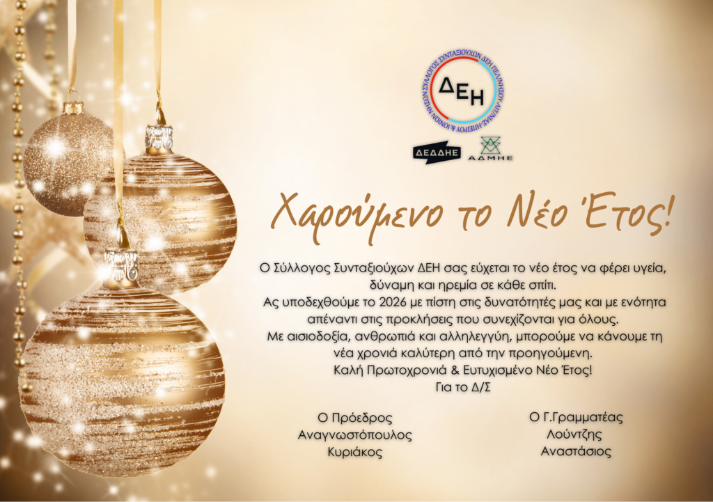 Χαρούμενο το Νέο Έτος!! Post author:admin Post published:30 Δεκεμβρίου, 2025 Post category:Ανακοινώσεις Post comments:0 Comments FacebookTweetPin FacebookTweetPin You Might Also Like Ο Σύλλογος Συνταξιούχων, η ΠΟΣ/ΔΕΗ & η ΓΕΝΟΠ διαμαρτύρονται έντονα κατά του αντεργατικού νομοσχεδίου της Κυβέρνησης. 10 Ιουνίου, 2021 Στο «χρονοντούλαπο» και εκτός ΚΕΠ 71 διαδικασίες του e-ΕΦΚΑ και του ΟΠΕΚΑ 22 Μαρτίου, 2022 Καλώς Όρισες Σεπτέμβρη! 1 Σεπτεμβρίου, 2022 Αφήστε μια απάντηση Ακύρωση απάντησηςCommentEnter your name or username to comment Enter your email address to comment Enter your website URL (optional) Αποθήκευσε το όνομά μου, email, και τον ιστότοπο μου σε αυτόν τον πλοηγό για την επόμενη φορά που θα σχολιάσω.